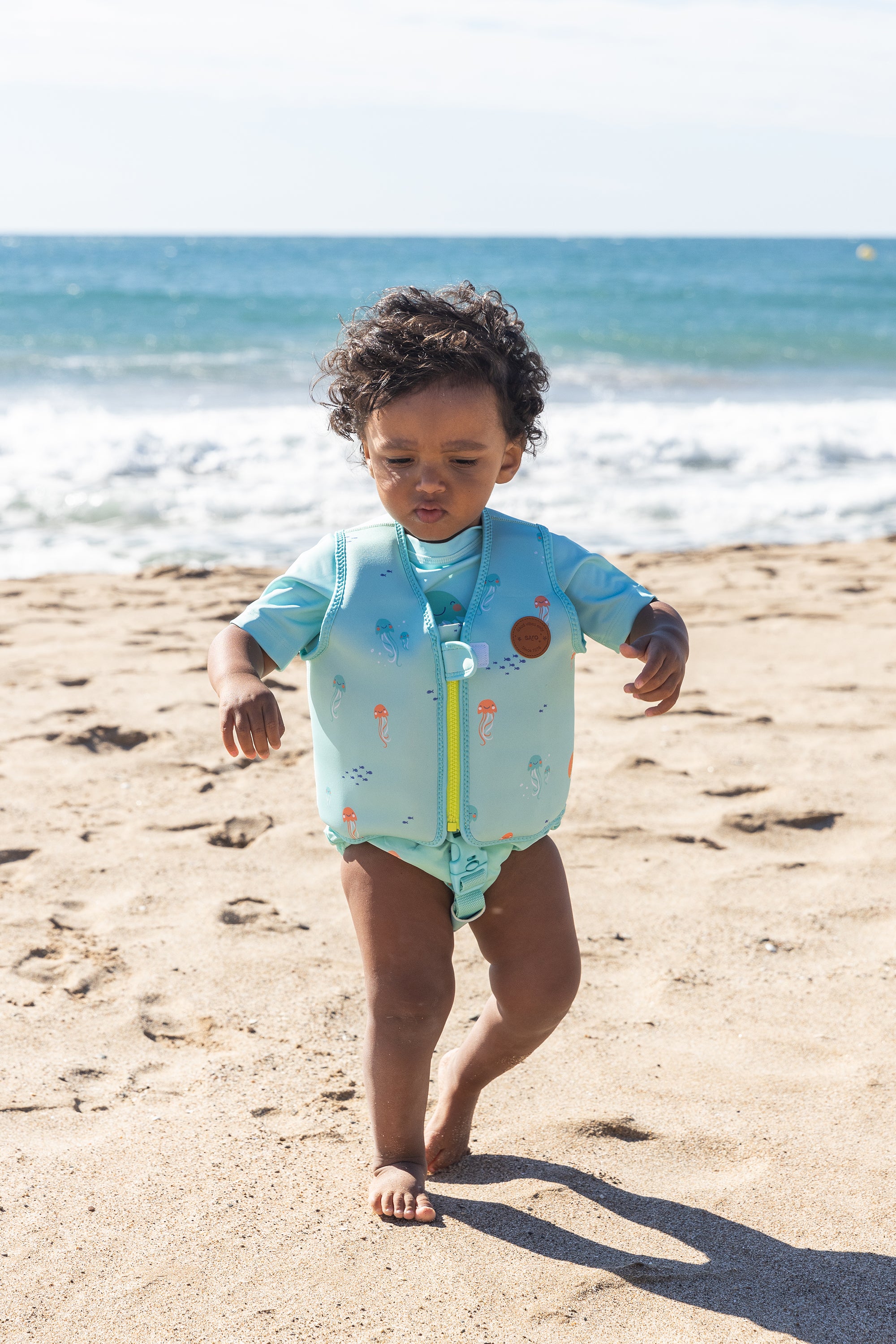 Chaleco de flotación modelo "Jellyfish" talla 1 - 3 años. Contiene elementos de flotación repartidos alrededor del torso (x8) que se pueden ir retirando a medida que el niño/a va adquiriendo soltura en el agua. Además, tiene una cintura ajustable de seguridad entre las piernas y 2 elementos de flotabilidad en los hombros. Se cierra con velcro y cremallera para que quede ajustado al cuerpo. Previsto para niños y niñas de unos 18kg máximo.