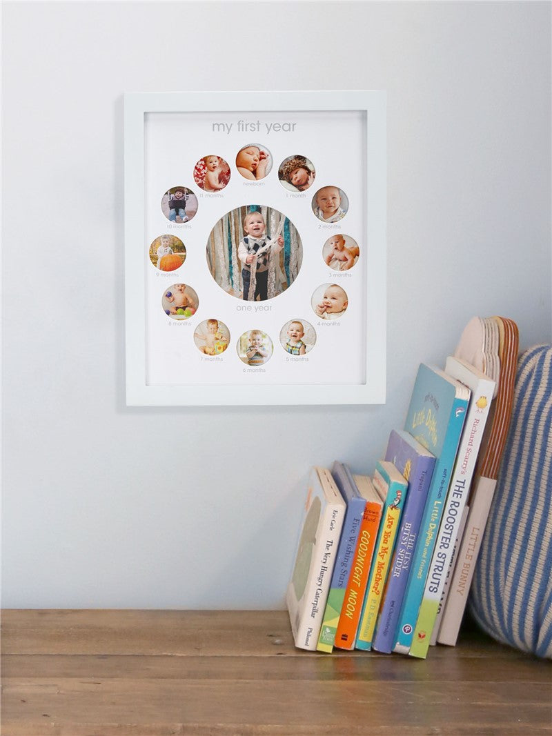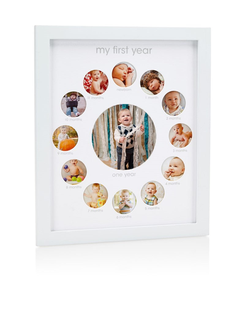 Conmemora el primer año de tu bebé mes a mes con este precioso marco de Pearhead. Un diseño elegante y minimalista en color blanco que incluye 12 espacios para fotos desde recién nacido hasta los 11 meses, y un espacio central para una foto especial de su primer cumpleaños.