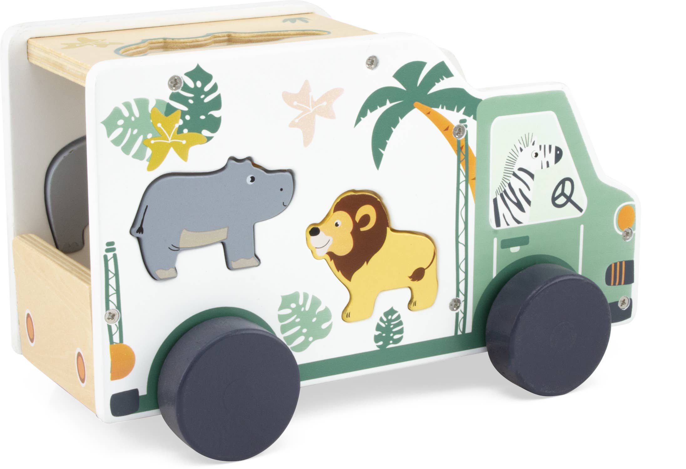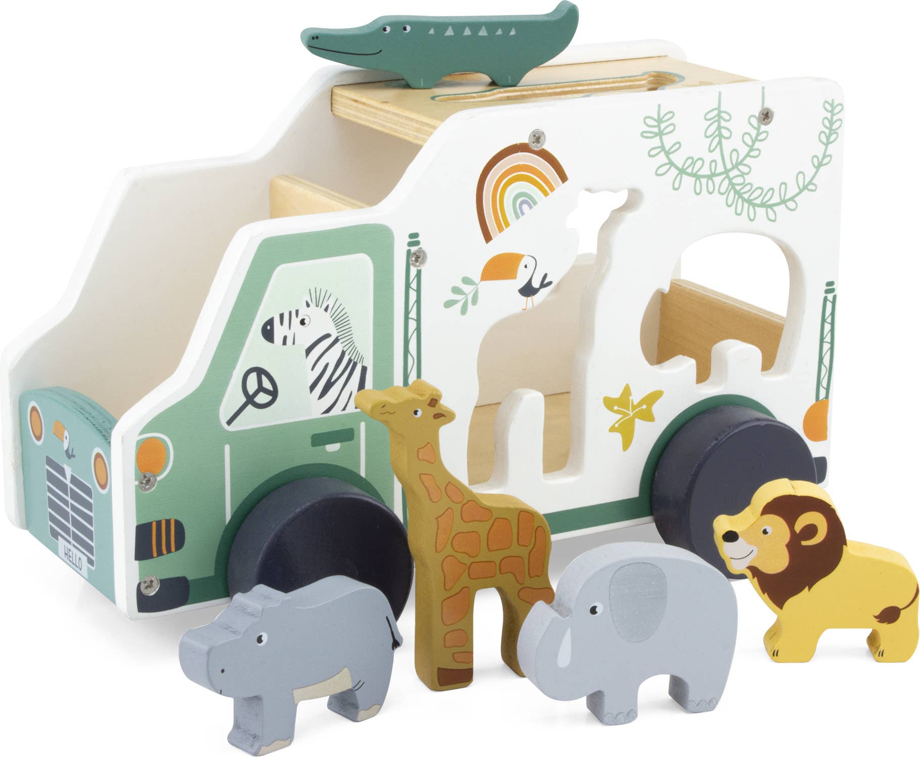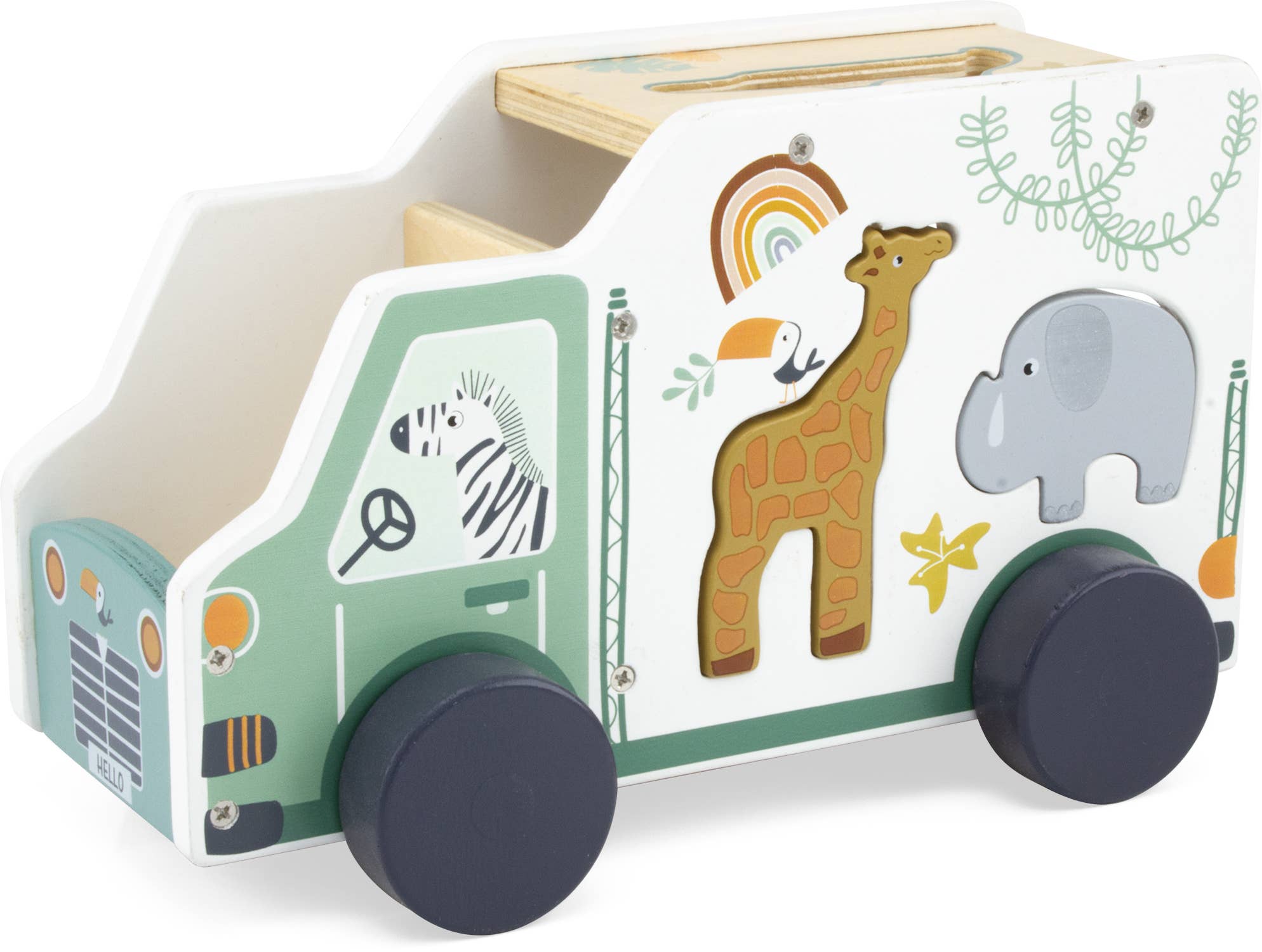Camión de madera para clasificar y ordenar animales. A los niños les encanta clasificar, apilar y jugar con vehículos de juguete. Clasificar las figuras ayuda a aprender a reconocer los colores y la percepción espacial. Al colocar los diferentes animales en el lugar correcto, también se estimula el desarrollo de la motricidad fina y la coordinación ojo/mano. Después de jugar, combinar, ordenar y apilar, ¡es hora de pasar a la siguiente aventura!