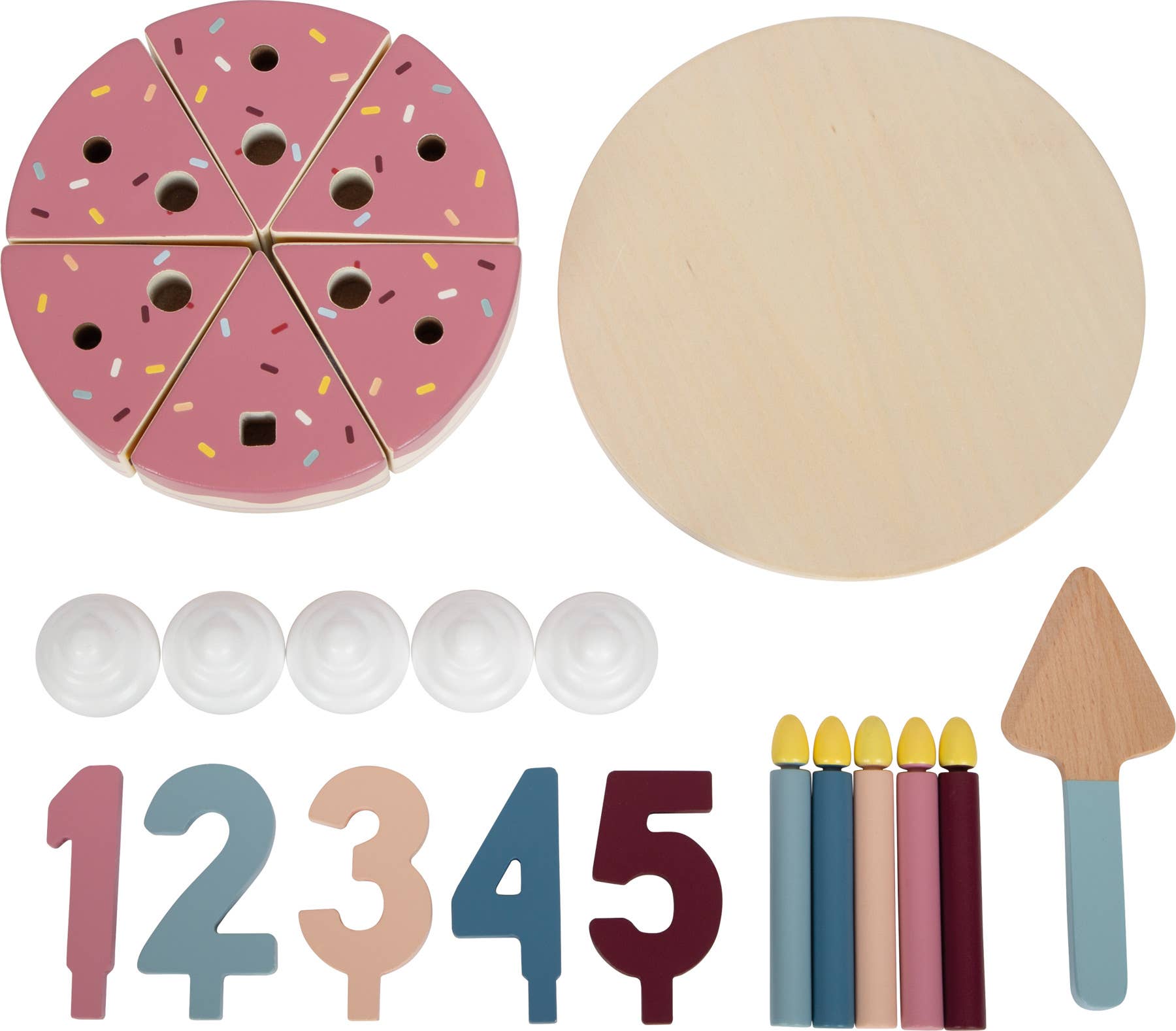 Las conexiones de velcro mantienen unidas la cobertura y las piezas individuales del pastel, que se pueden separar fácilmente con el elevador de tartas y distribuirlas desde el plato para tartas. Las habilidades motoras y la coordinación mano-ojo se entrenan de forma lúdica. En el juego de rol, los niños pueden dejar volar su imaginación y celebrar sus cumpleaños o los de sus muñecas o peluches favoritos con la tarta de cumpleaños. Al decorar con adornos flexibles para tartas, también se entrenan las habilidades motoras finas al mismo tiempo.