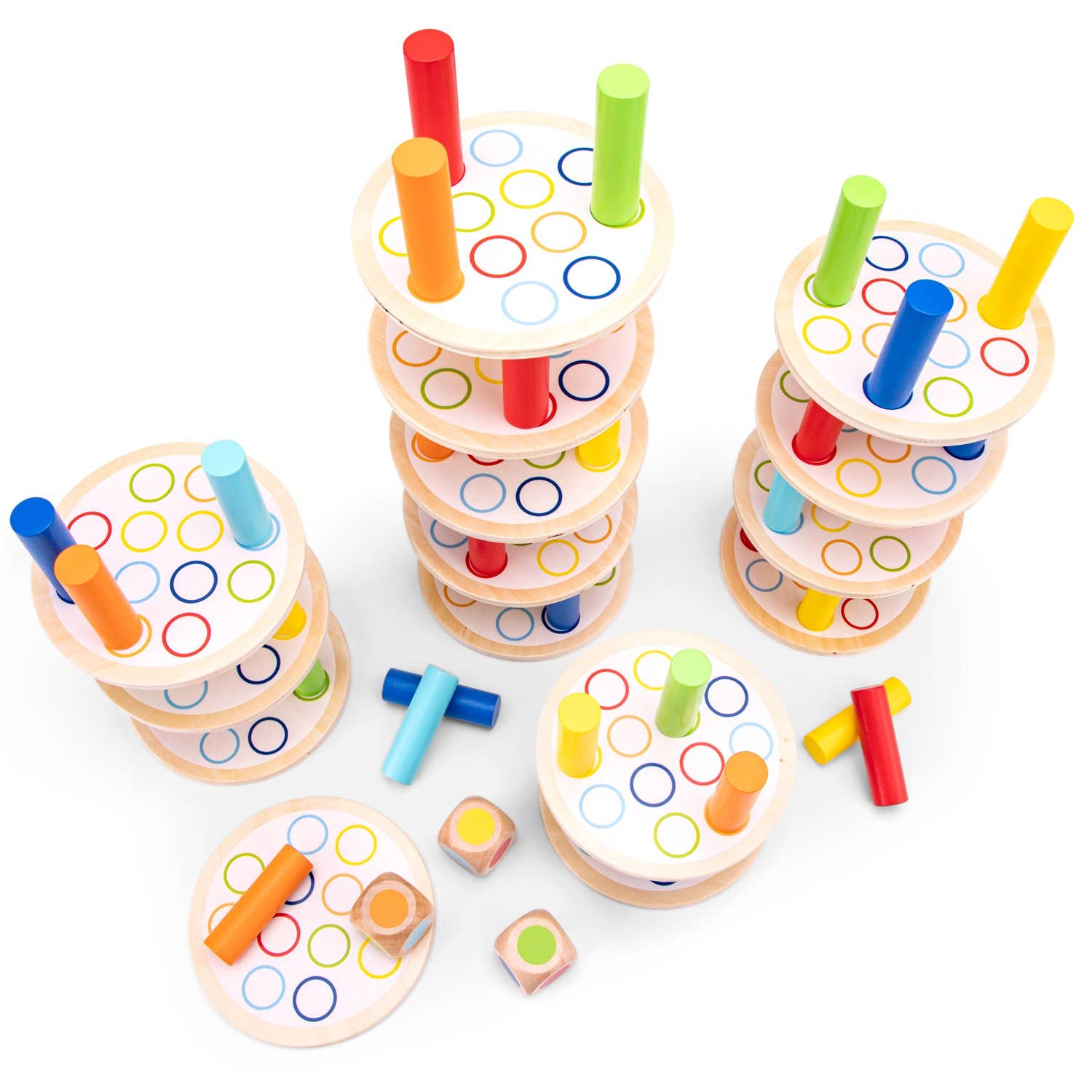 Contiene: 48 pilares de madera, 15 bases, 3 dados y 1 bolsa de algodón para un fácil almacenamiento. Cada pieza es de colores brillantes, tiene un acabado suave y es fácil de agarrar para las manos más pequeñas.