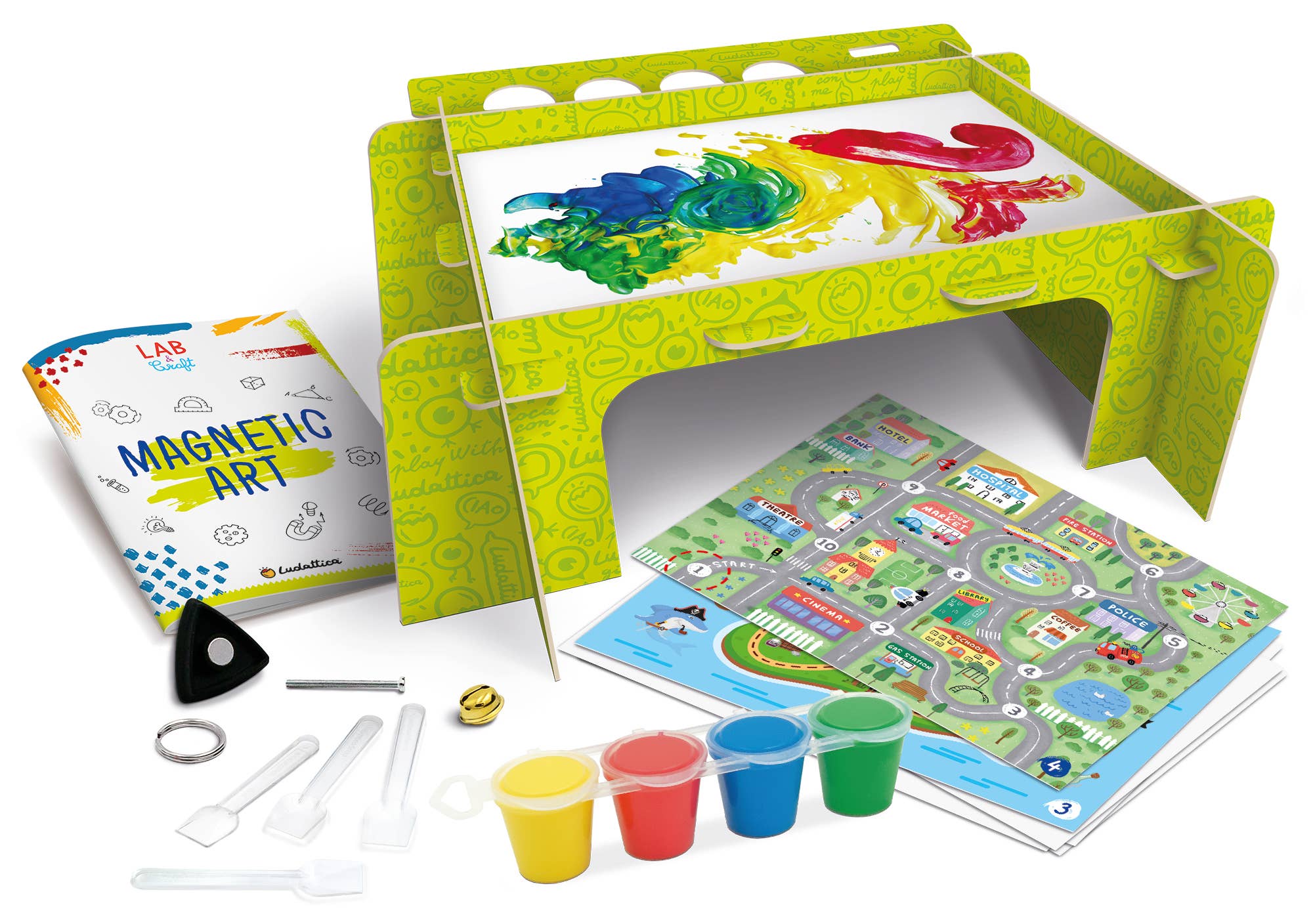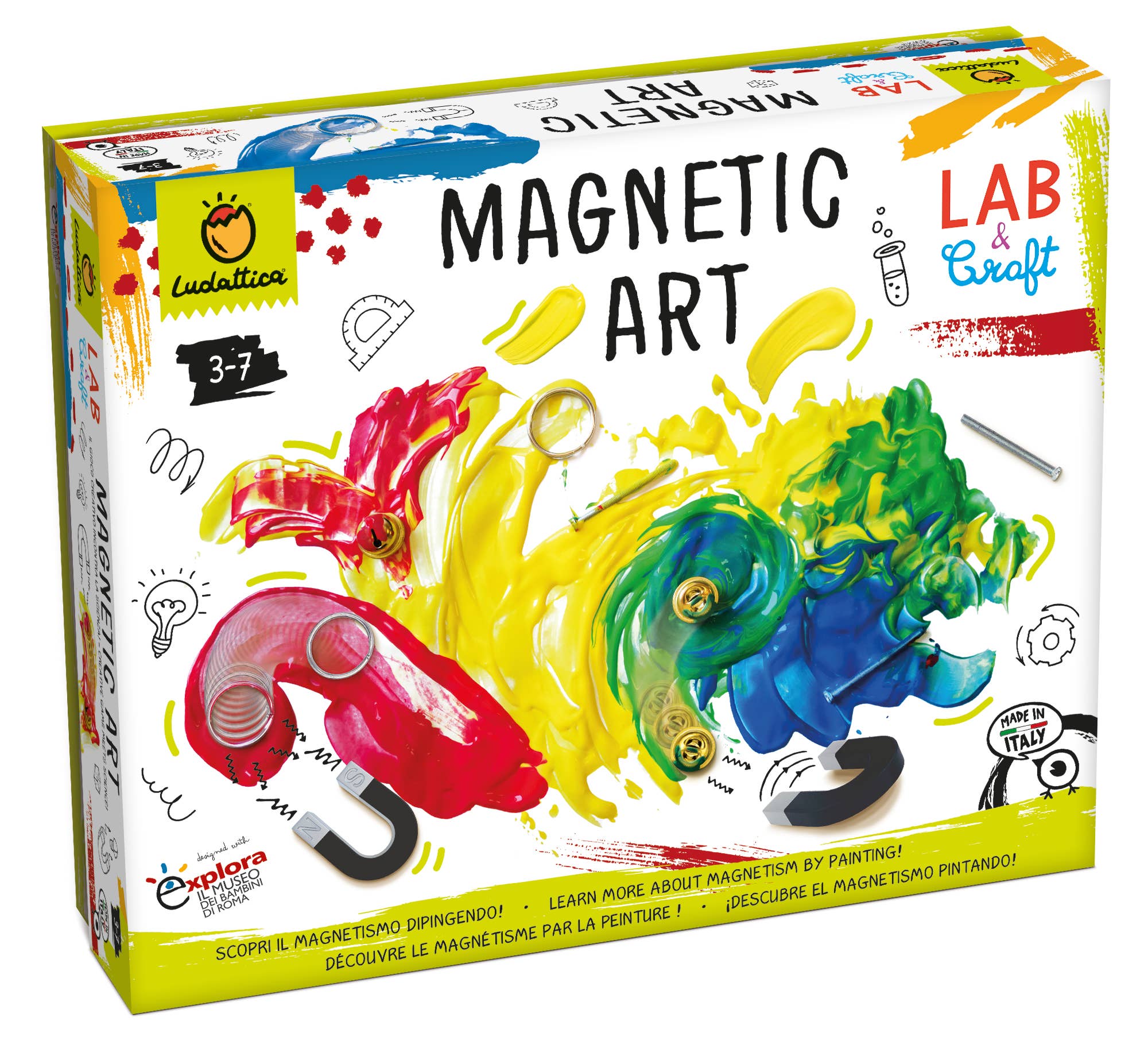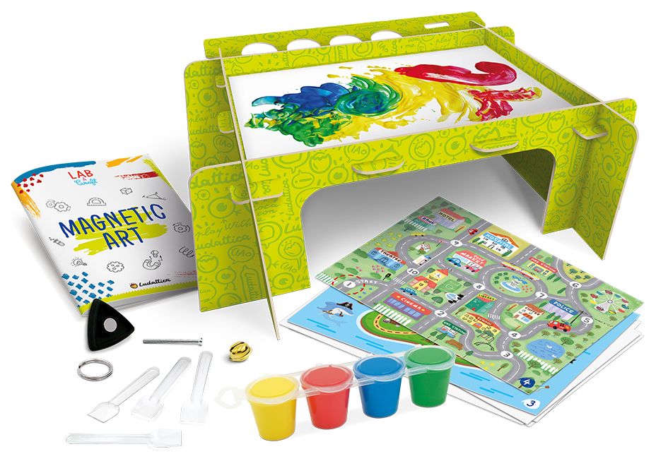 Un juego que combina la observación del fenómeno de los imanes, capaces de atraer, arrastrar y mover objetos, con una experiencia pictórica artística y creativa, dando forma a pinturas increíbles y nuevas. El manual está repleto de curiosidades y actividades para hacer de este juego una verdadera experiencia educativa.