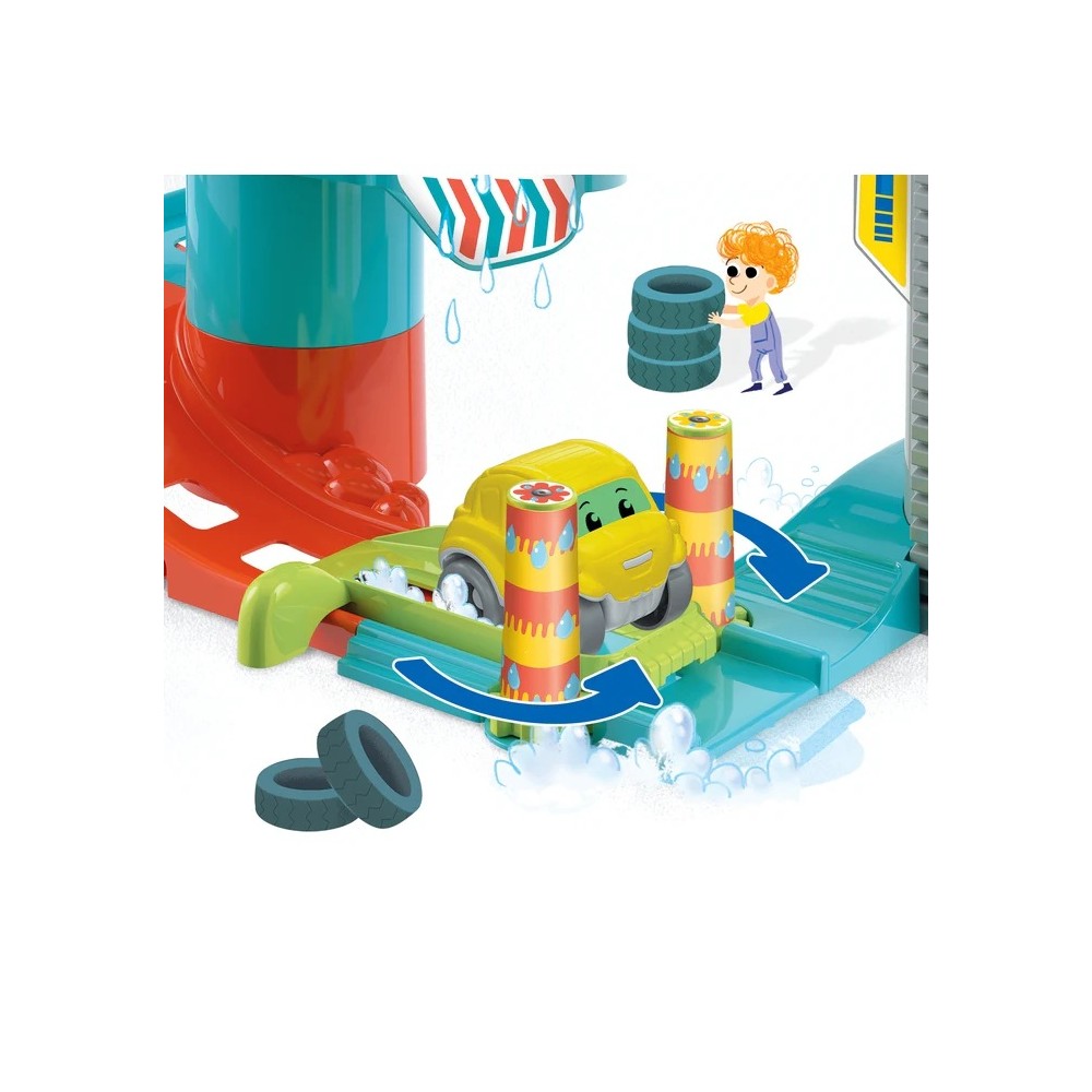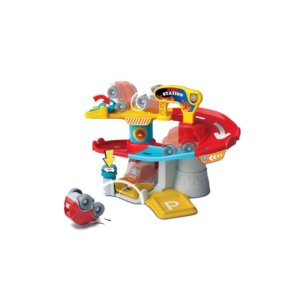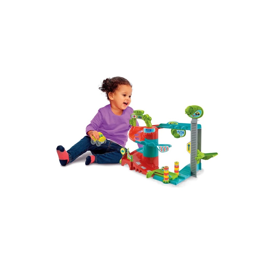 Un divertido garaje interactivo con rampas, catapultas y un coche volteretas incluido, pensado para estimular la curiosidad, la coordinación y la imaginación de los más pequeños desde sus primeros juegos.