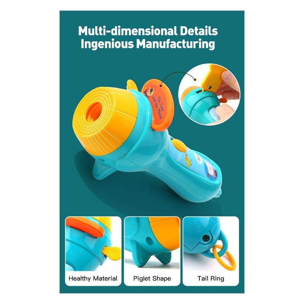 El proyector con linterna permite reproducir distintas historias al insertar los discos de cuentos, proyectando las imágenes sobre la pared o sobre el teatro incluido. Las escenas cobran vida con una luz suave que envuelve el espacio y estimula la imaginación, favoreciendo un ambiente de calma y atención compartida.