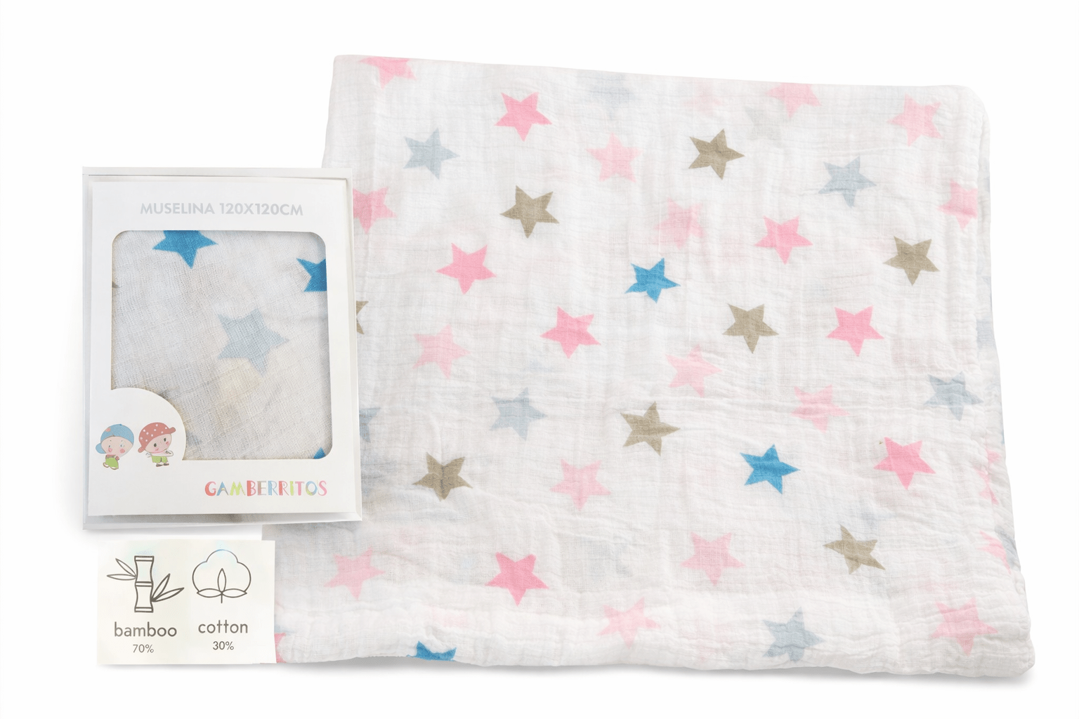 Muselina de bambú y algodón muy suave y ligera, perfecta para cuidar la piel del bebé gracias a su tejido transpirable y delicado. Su gran tamaño de 120x120 cm la hace ideal como arrullo, mantita, cubierta de lactancia o toalla ligera.