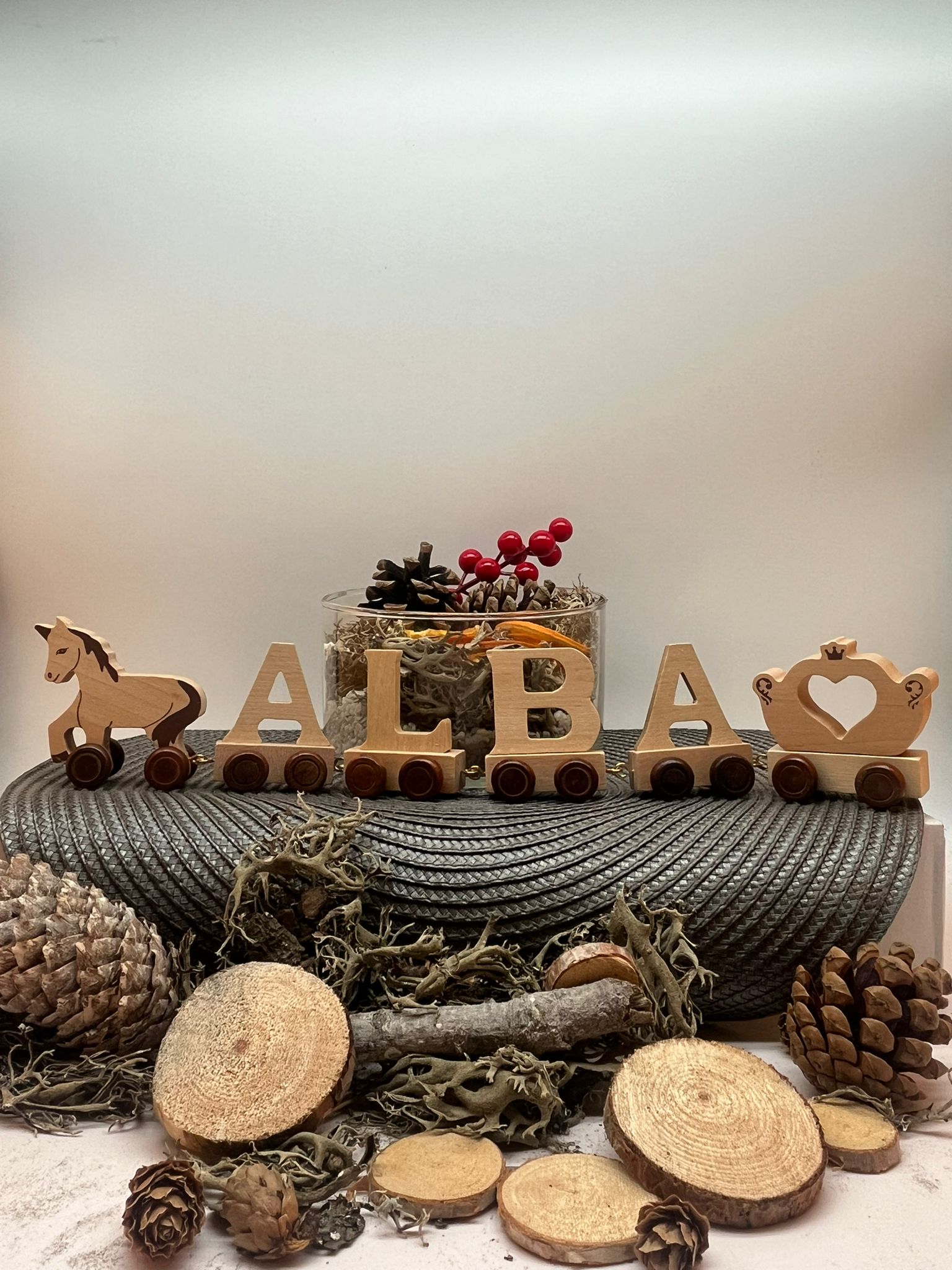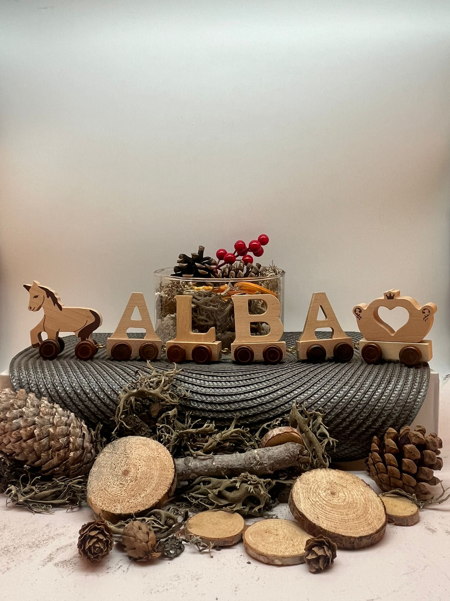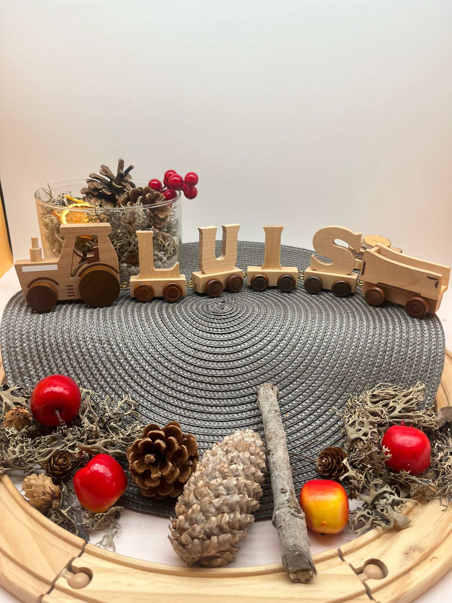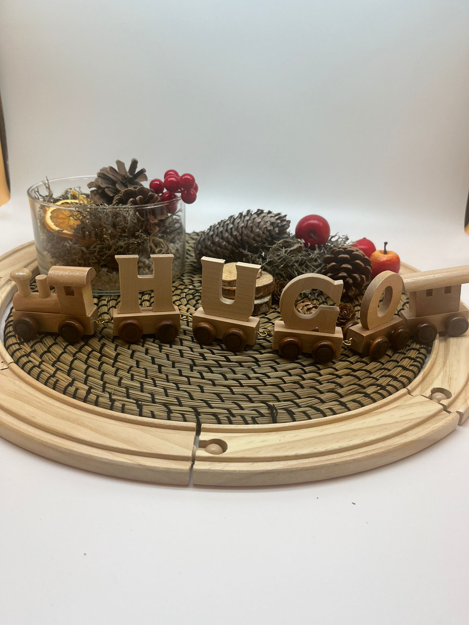 Descubre la magia de la personalización con nuestro encantador tren de madera, diseñado para deleitar a los más pequeños y fomentar el juego creativo. Este tren único se compone de vagones que llevan las letras del nombre de tu niño o niña, convirtiéndolo en un regalo verdaderamente especial y personal.