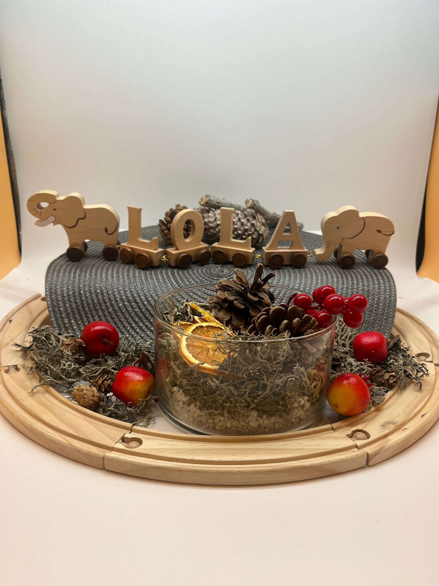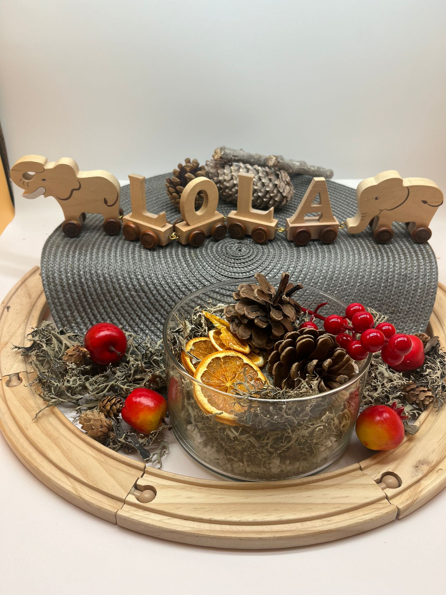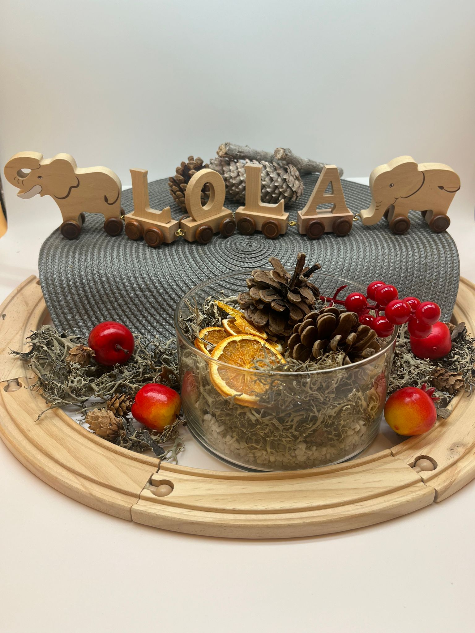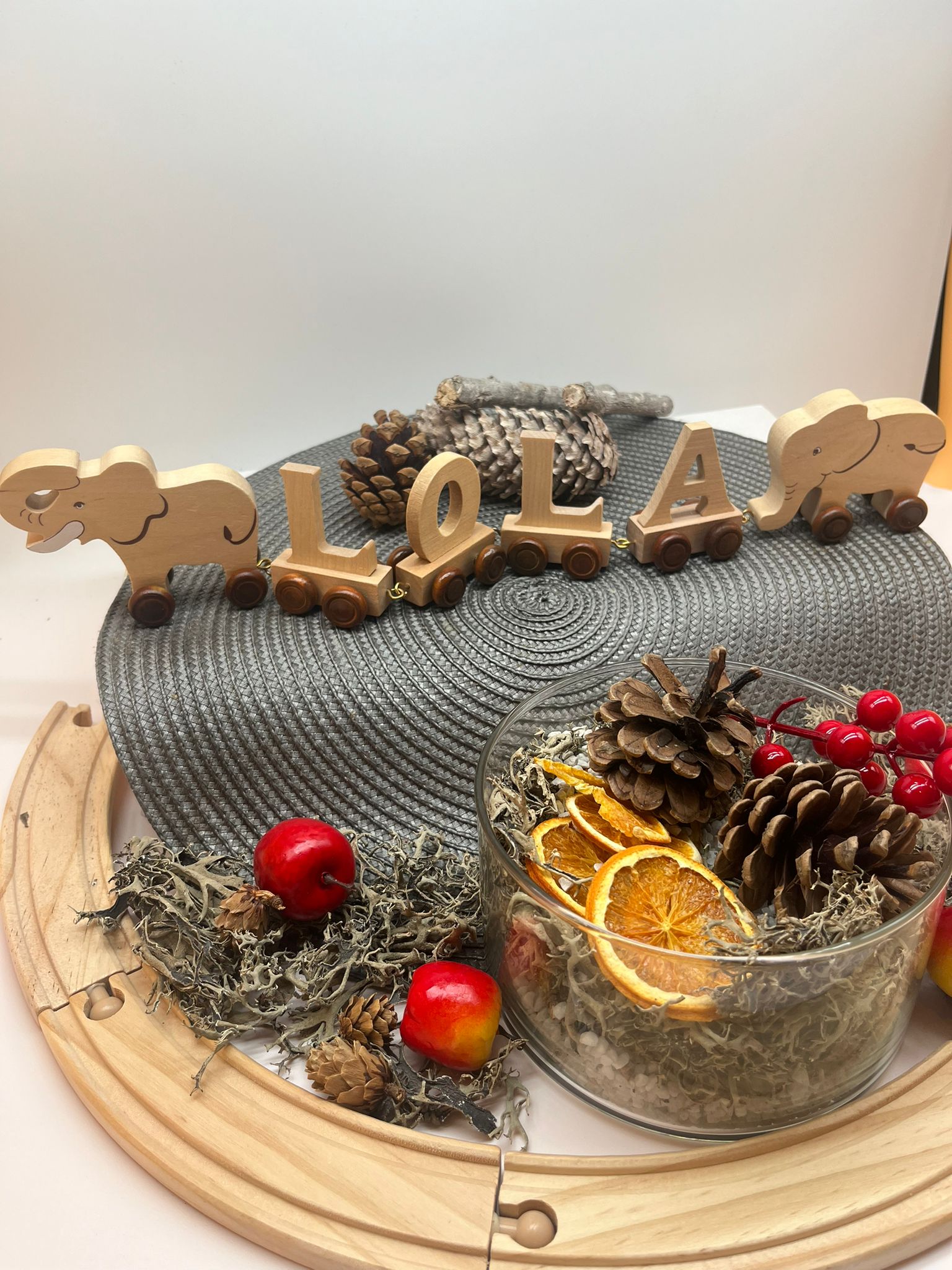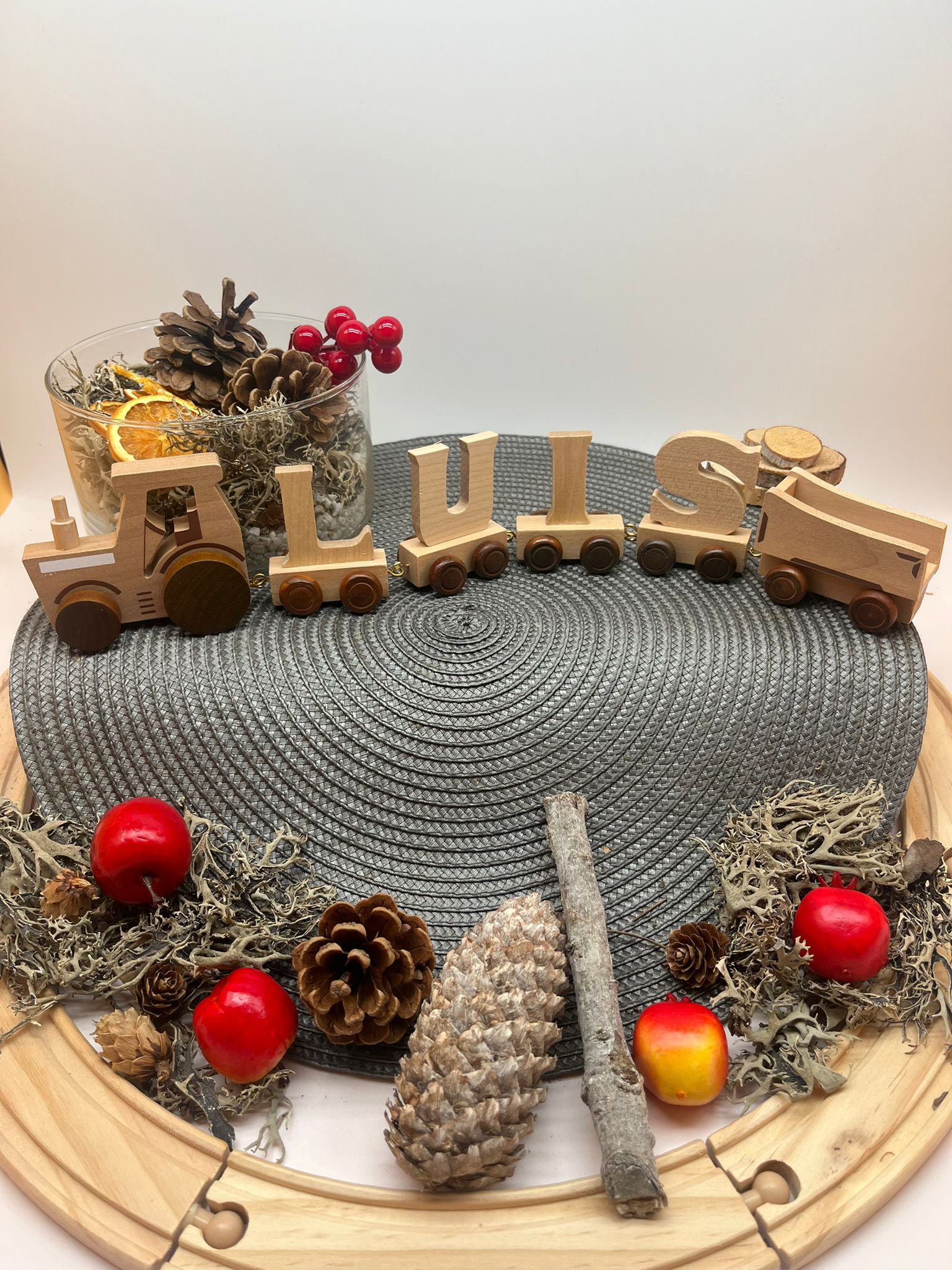Descubre la magia de la personalización con nuestro encantador tren de madera, diseñado para deleitar a los más pequeños y fomentar el juego creativo. Este tren único se compone de vagones que llevan las letras del nombre de tu niño o niña, convirtiéndolo en un regalo verdaderamente especial y personal.