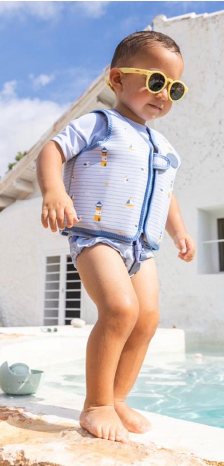 Chaleco de flotación modelo " Navy Hugs Collection" talla 3-6 años. Contiene elementos de flotación repartidos alrededor del torso (x8) que se pueden ir retirando a medida que el niño/a va adquiriendo soltura en el agua. Además, tiene una cintura ajustable de seguridad entre las piernas y 2 elementos de flotabilidad en los hombros. Se cierra con velcro y cremallera para que quede ajustado al cuerpo. Previsto para niños y niñas de unos 18kg máximo.