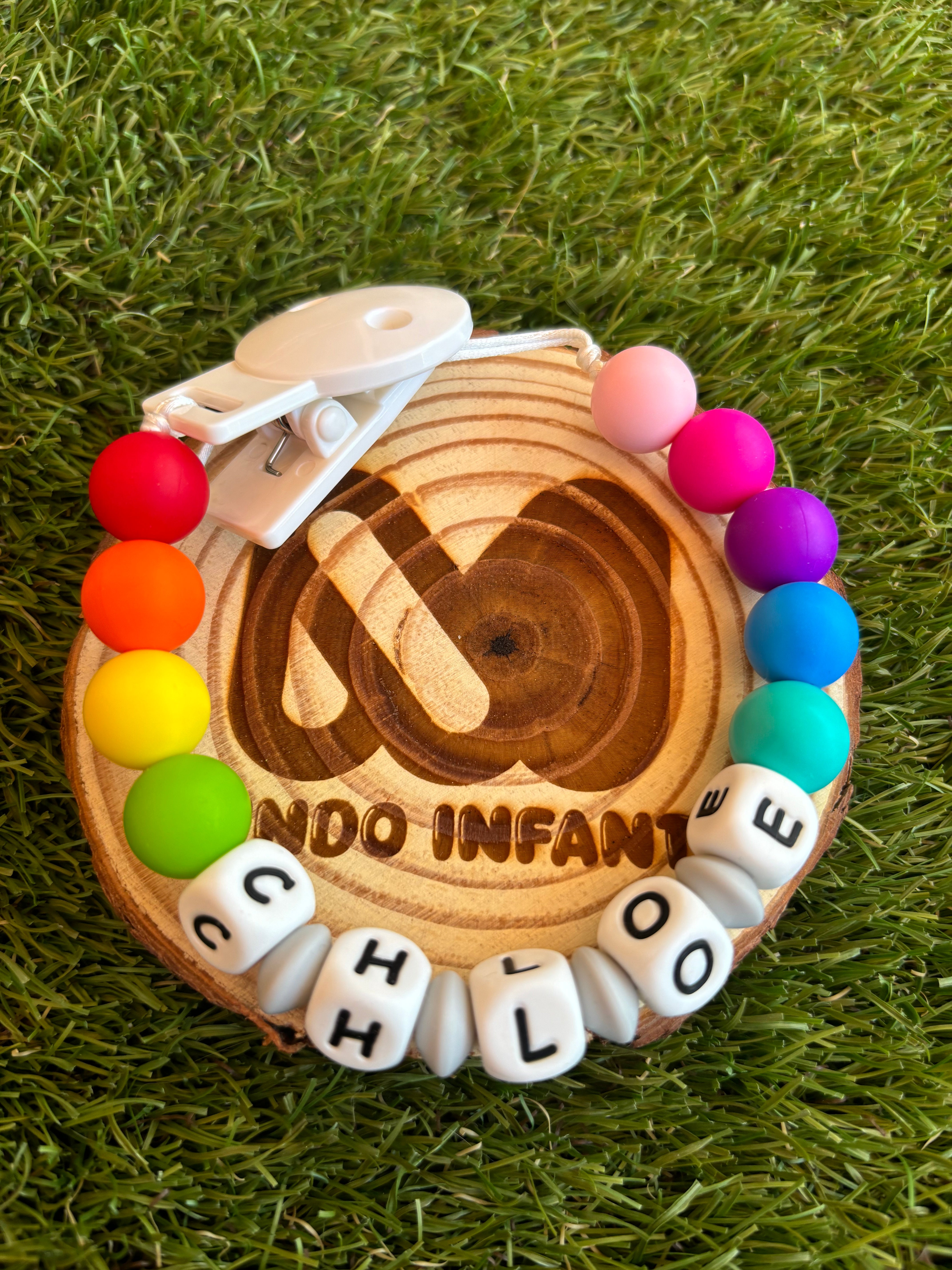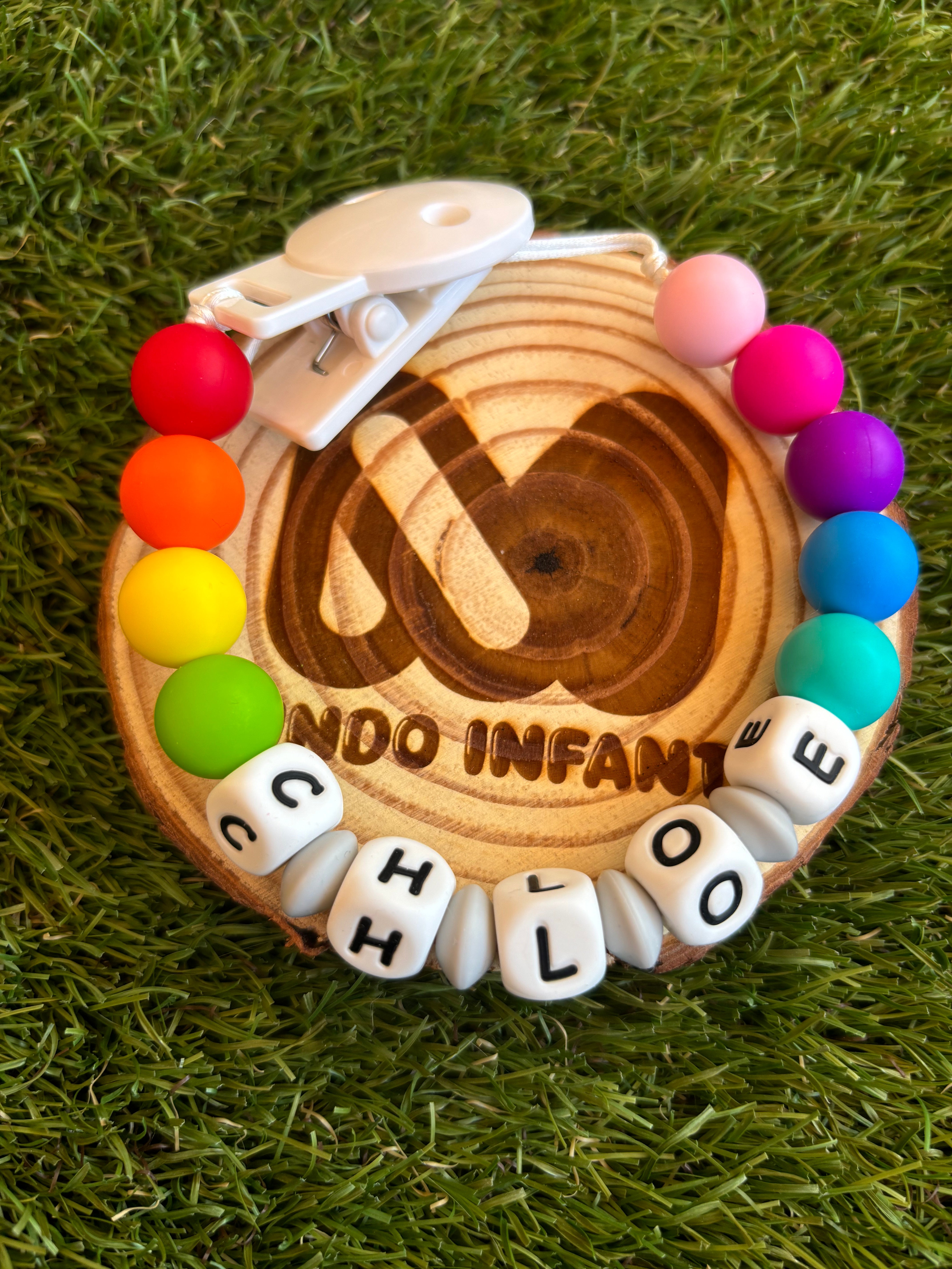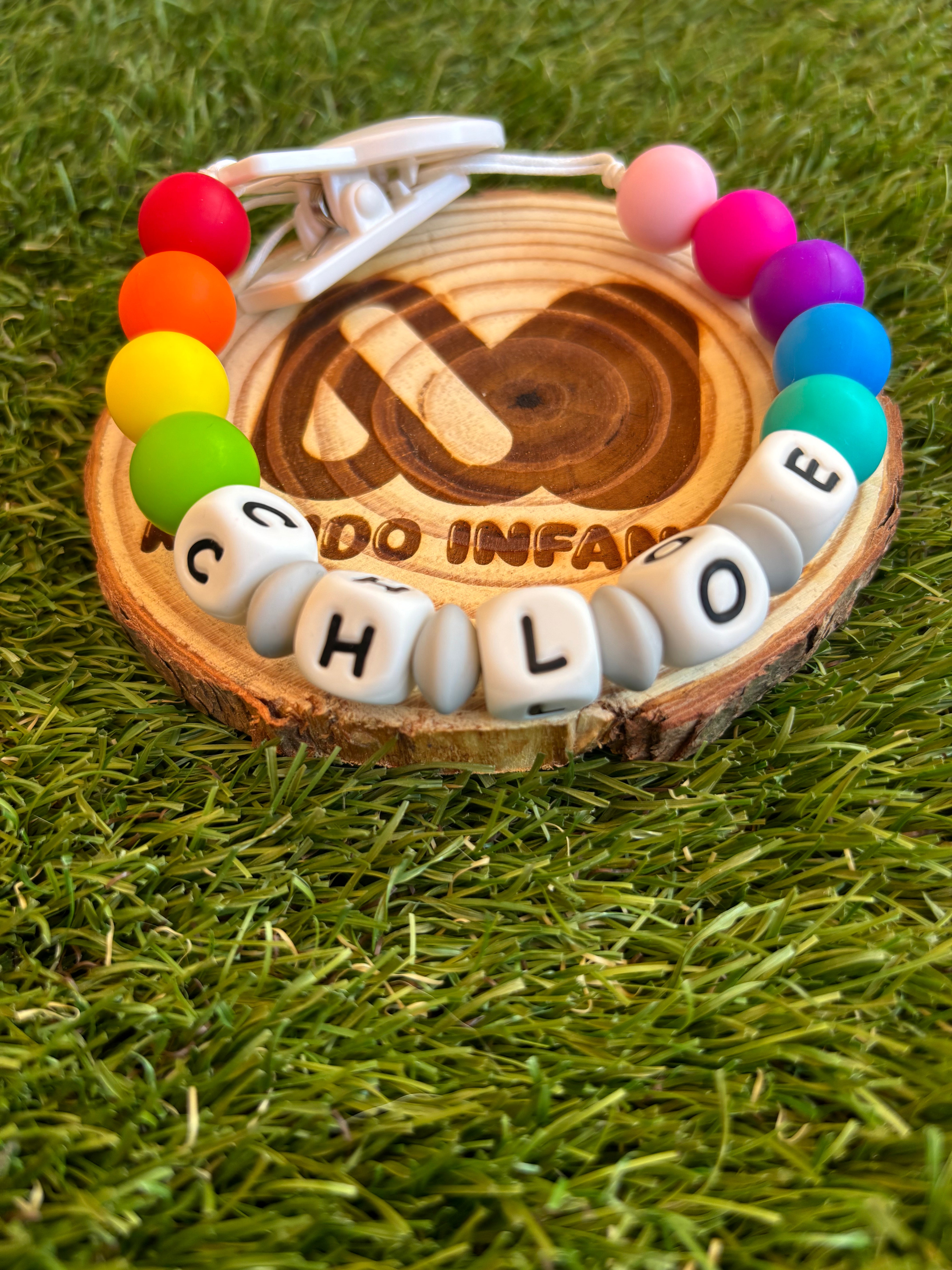 Chupetero de silicona multicolor (modelo arcoiris) completamente personalizado. Sirve para sujetar el chupete o mordedor de tu pequeño/a para que no pierdas nada en tus delicados paseos.