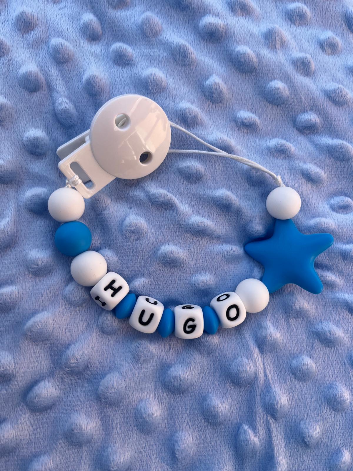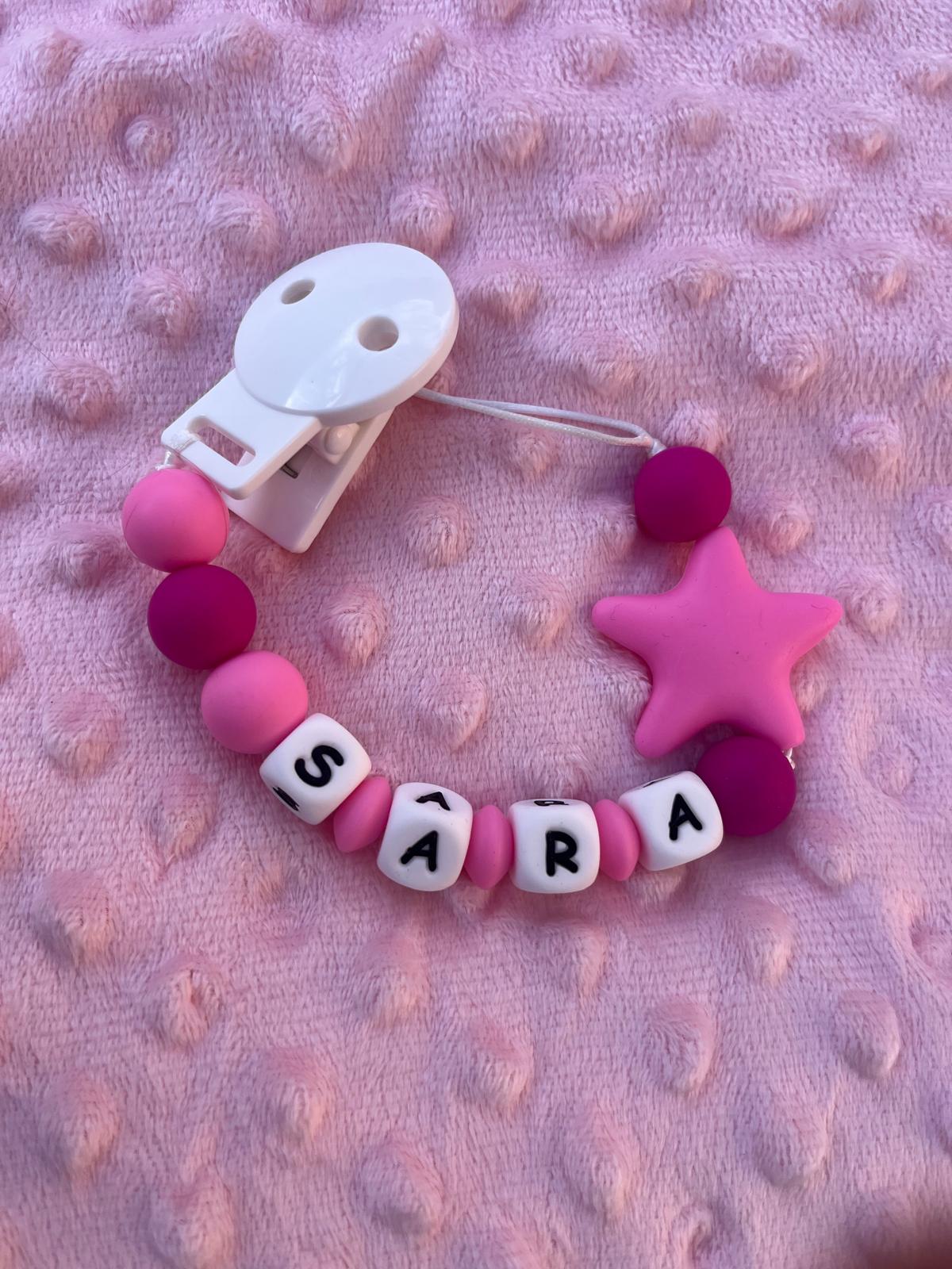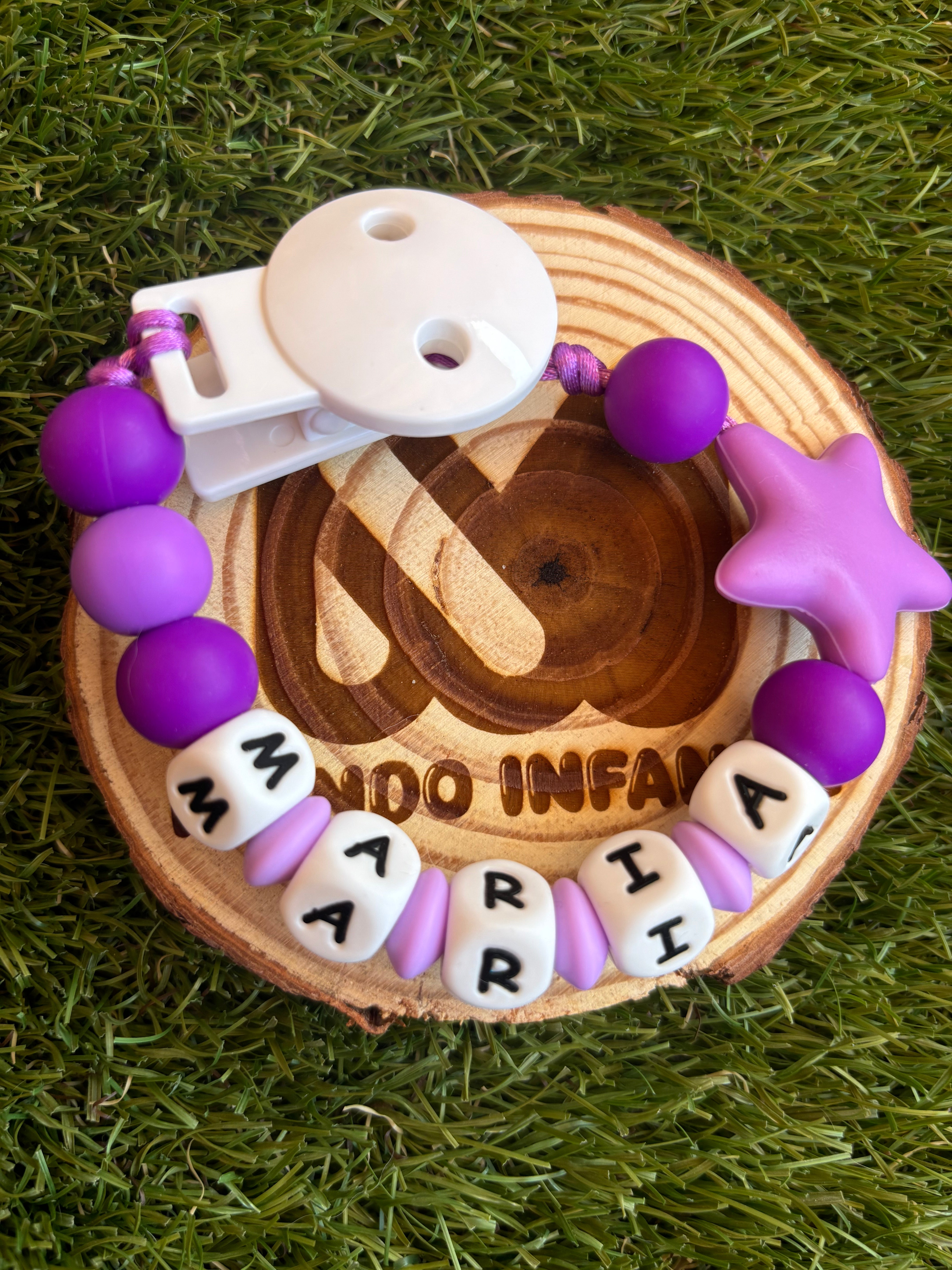 Chupetero de silicona morado (modelo estrella) completamente personalizado. Sirve para sujetar el chupete o mordedor de tu pequeño/a para que no pierdas nada en tus delicados paseos.