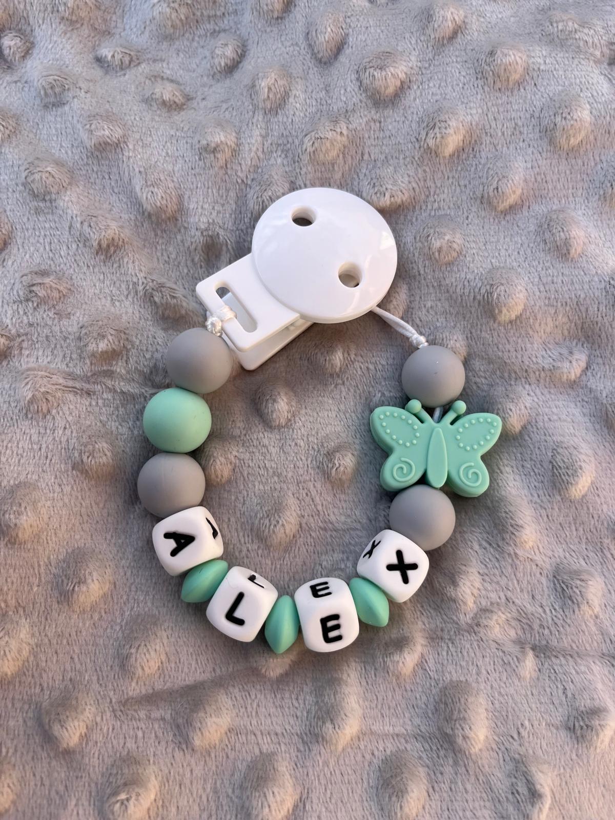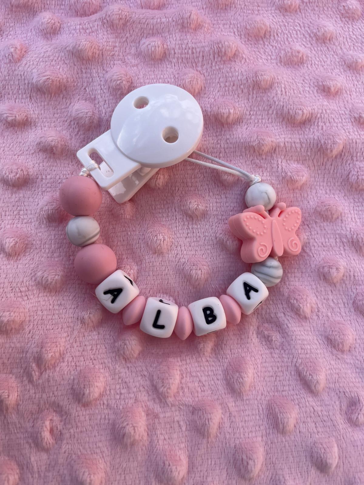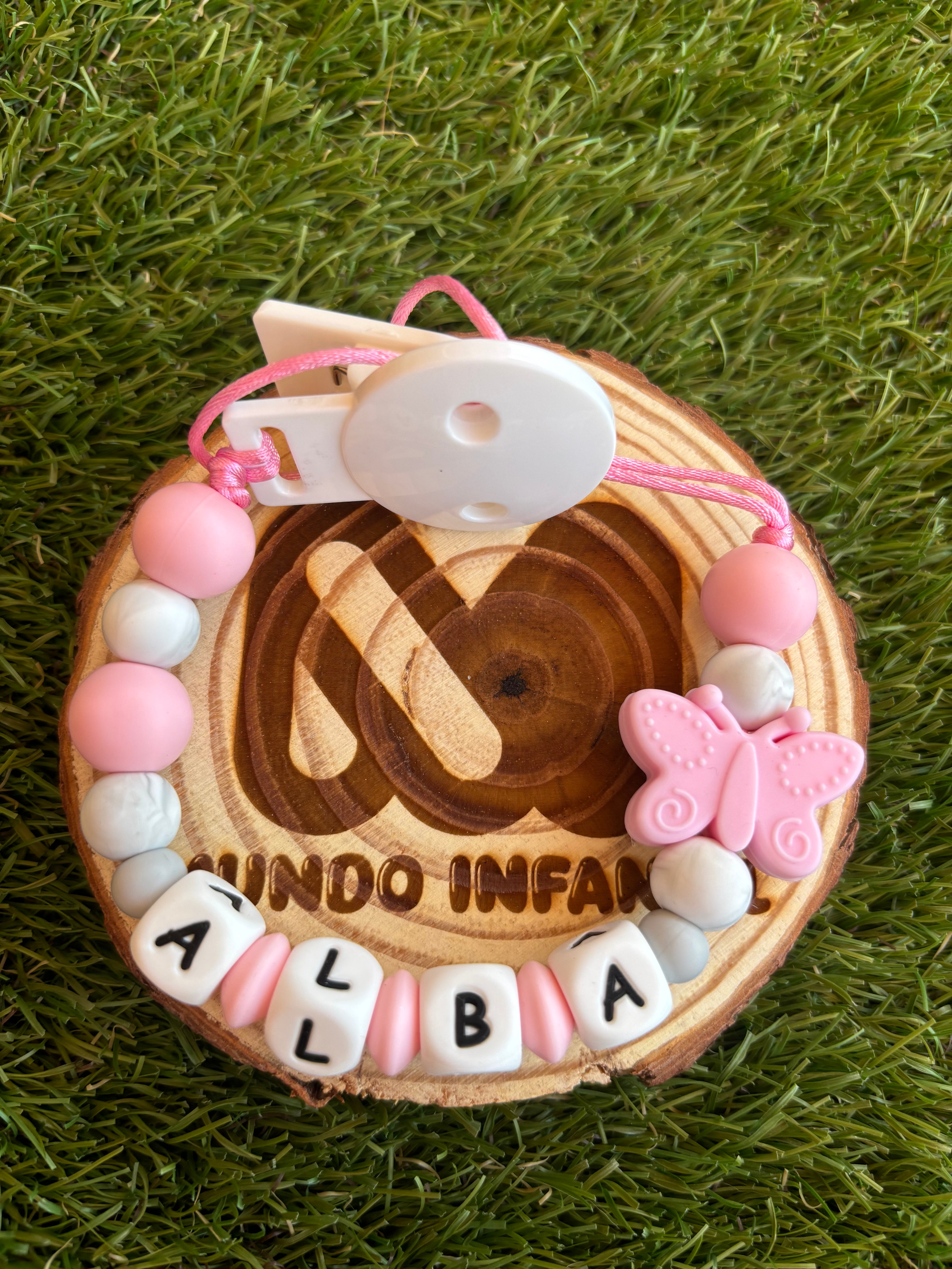 Chupetero de silicona (modelo mariposa) completamente personalizado. Sirve para sujetar el chupete o mordedor de tu pequeño/a para que no pierdas nada en tus delicados paseos.