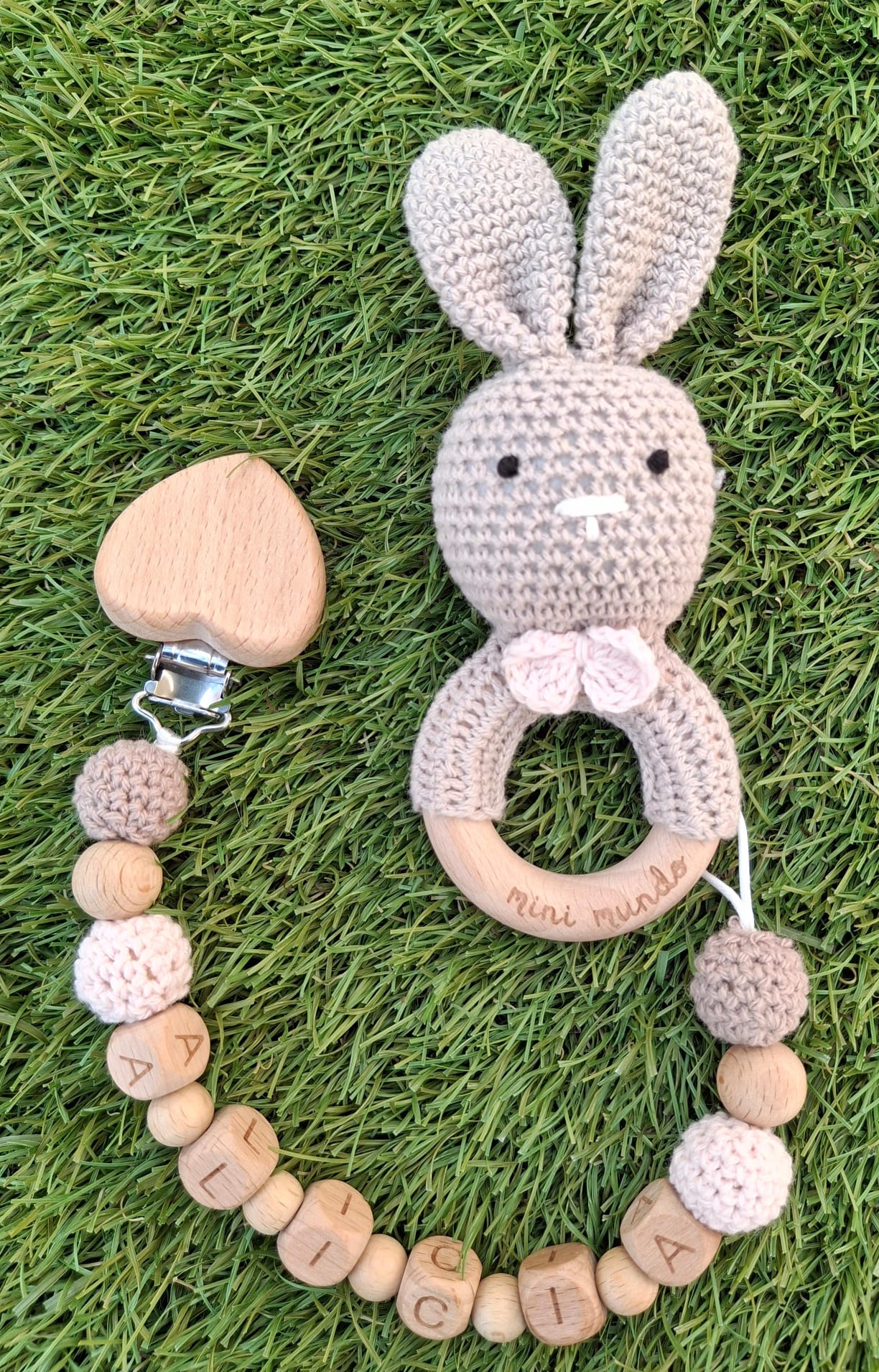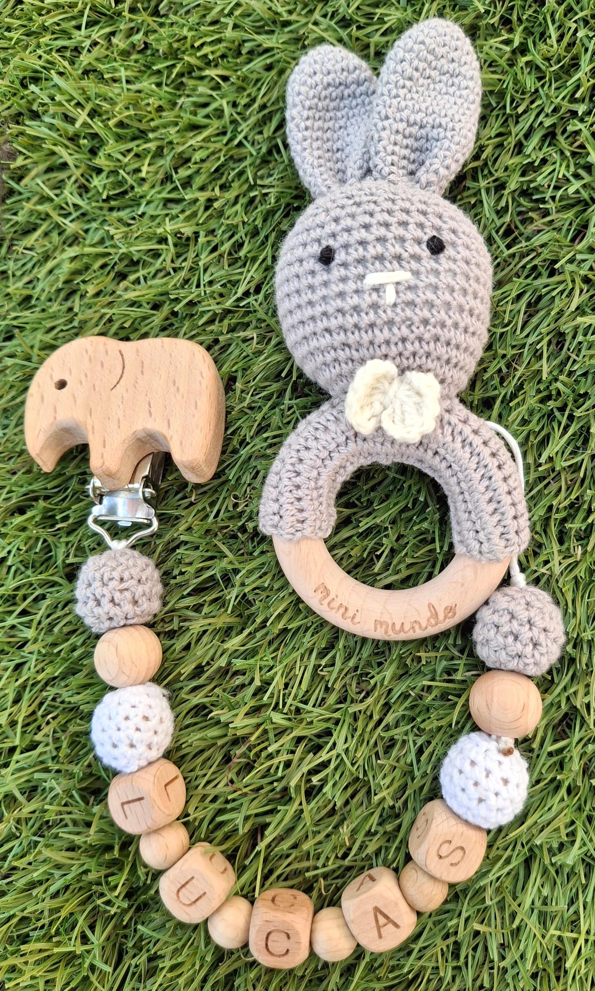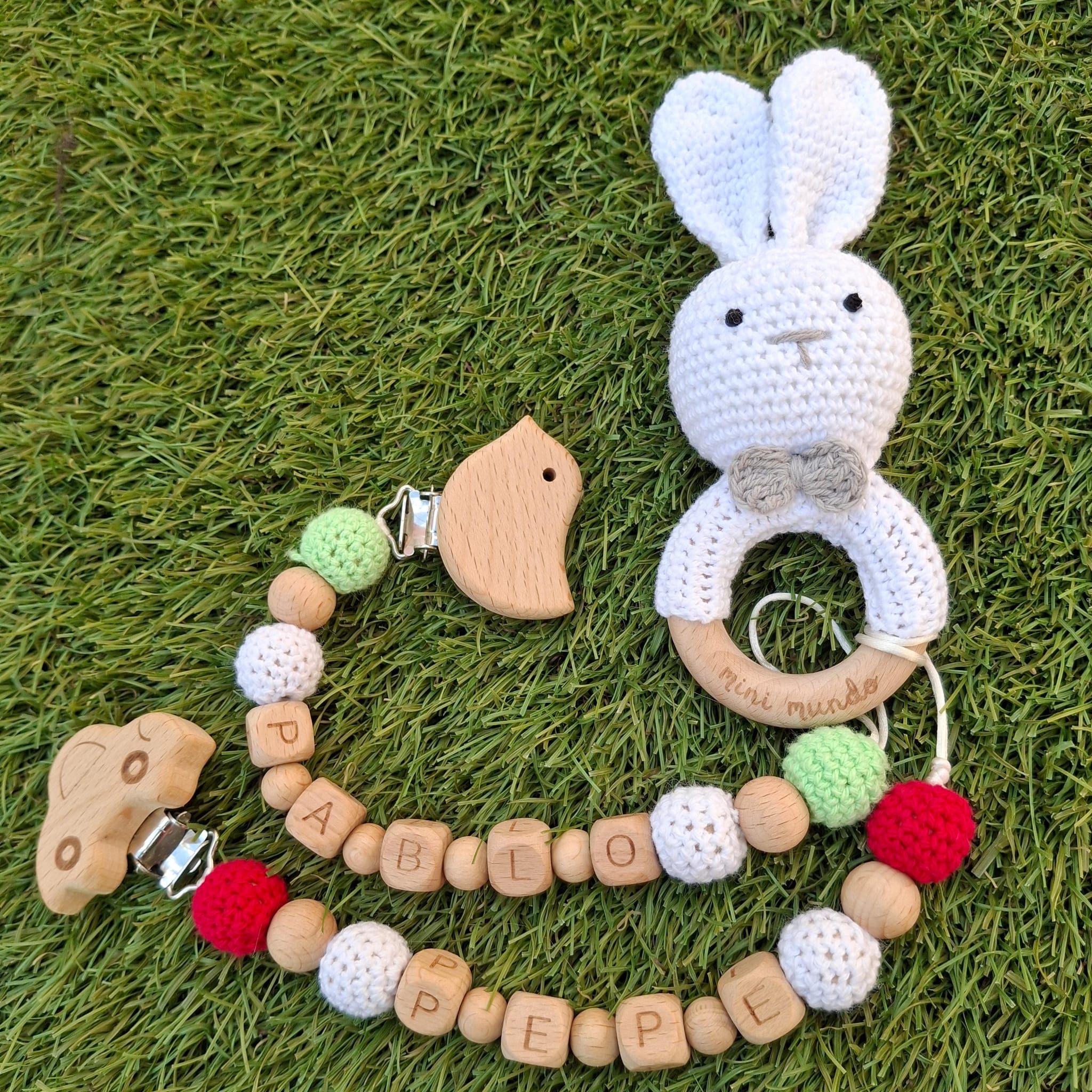 El pack contiene: chupetero de madera de haya 100% personalizado y sonajero.