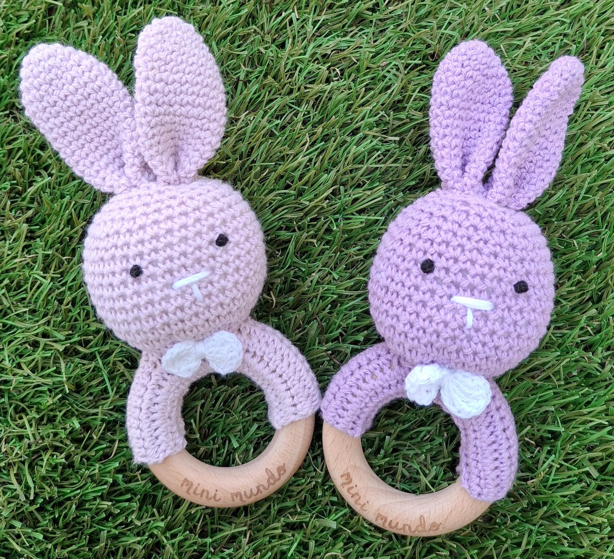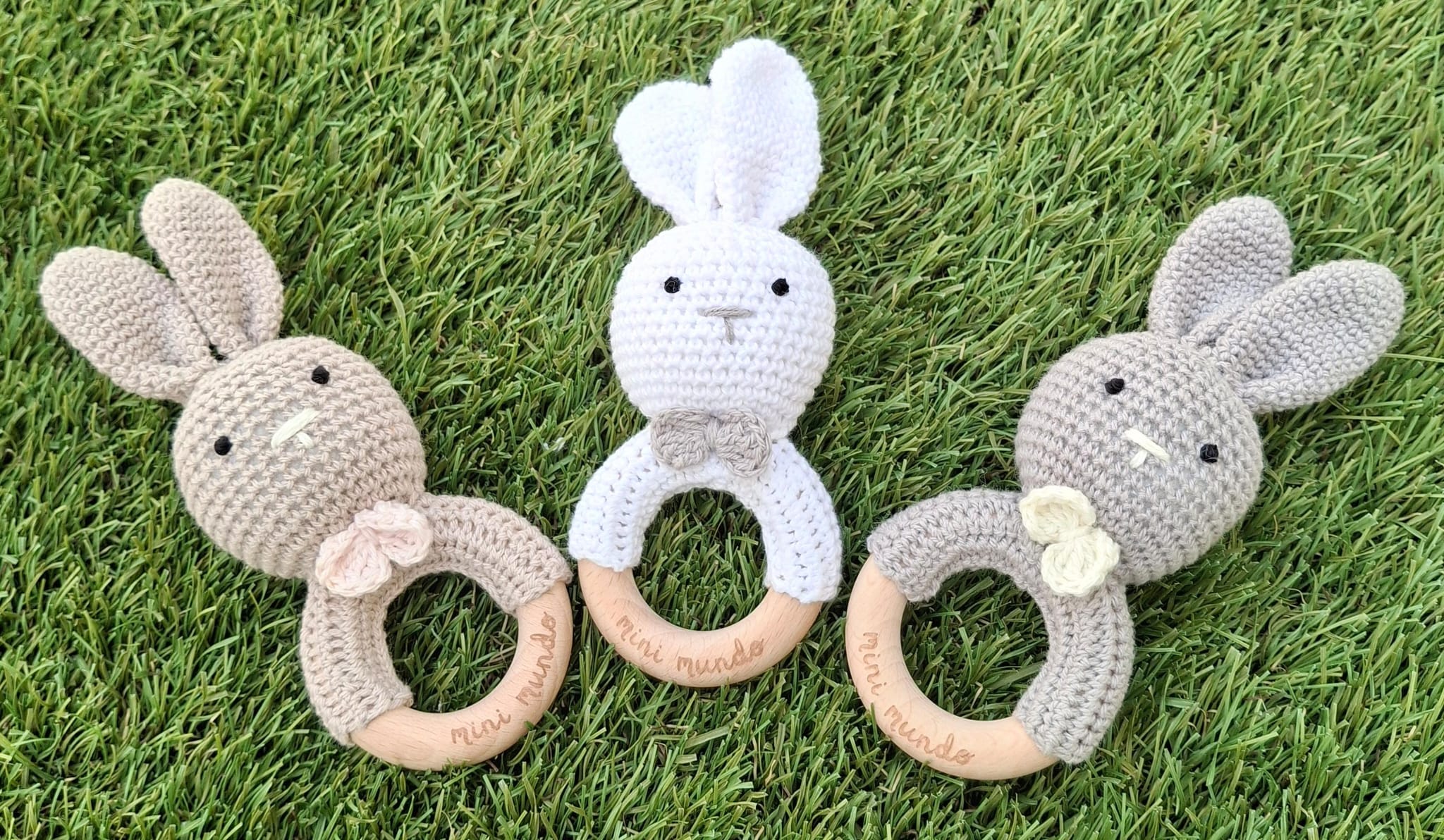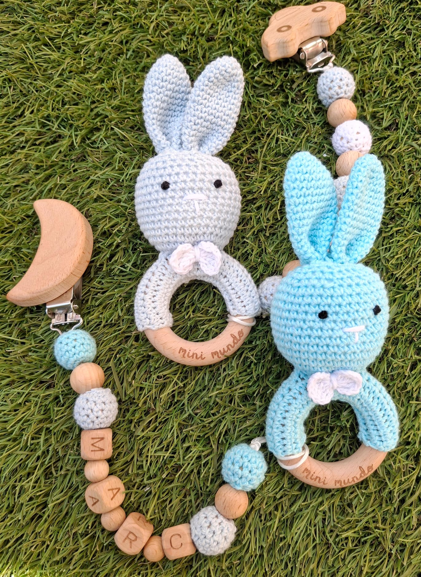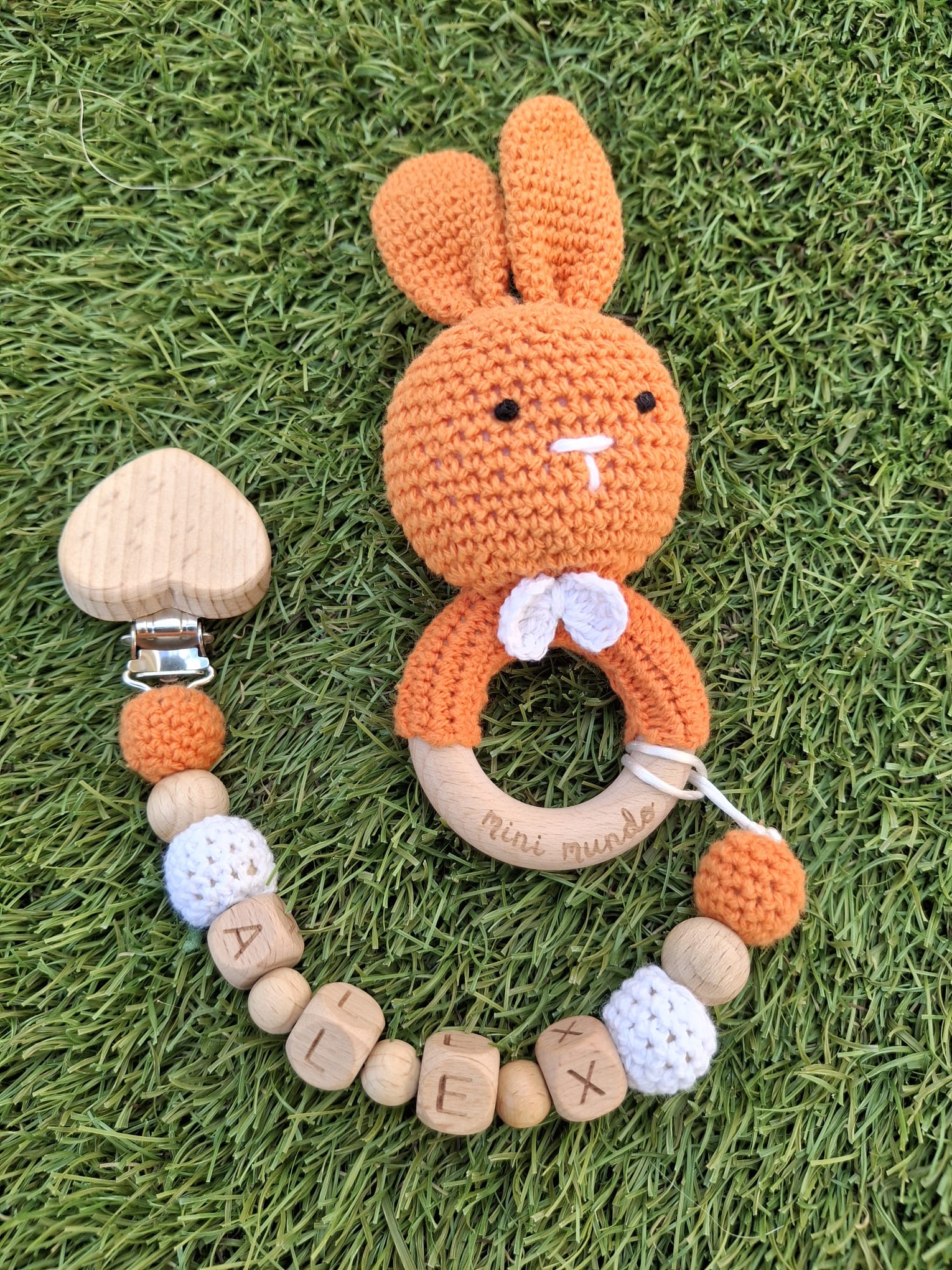 El pack contiene: chupetero de madera de haya 100% personalizado y sonajero.