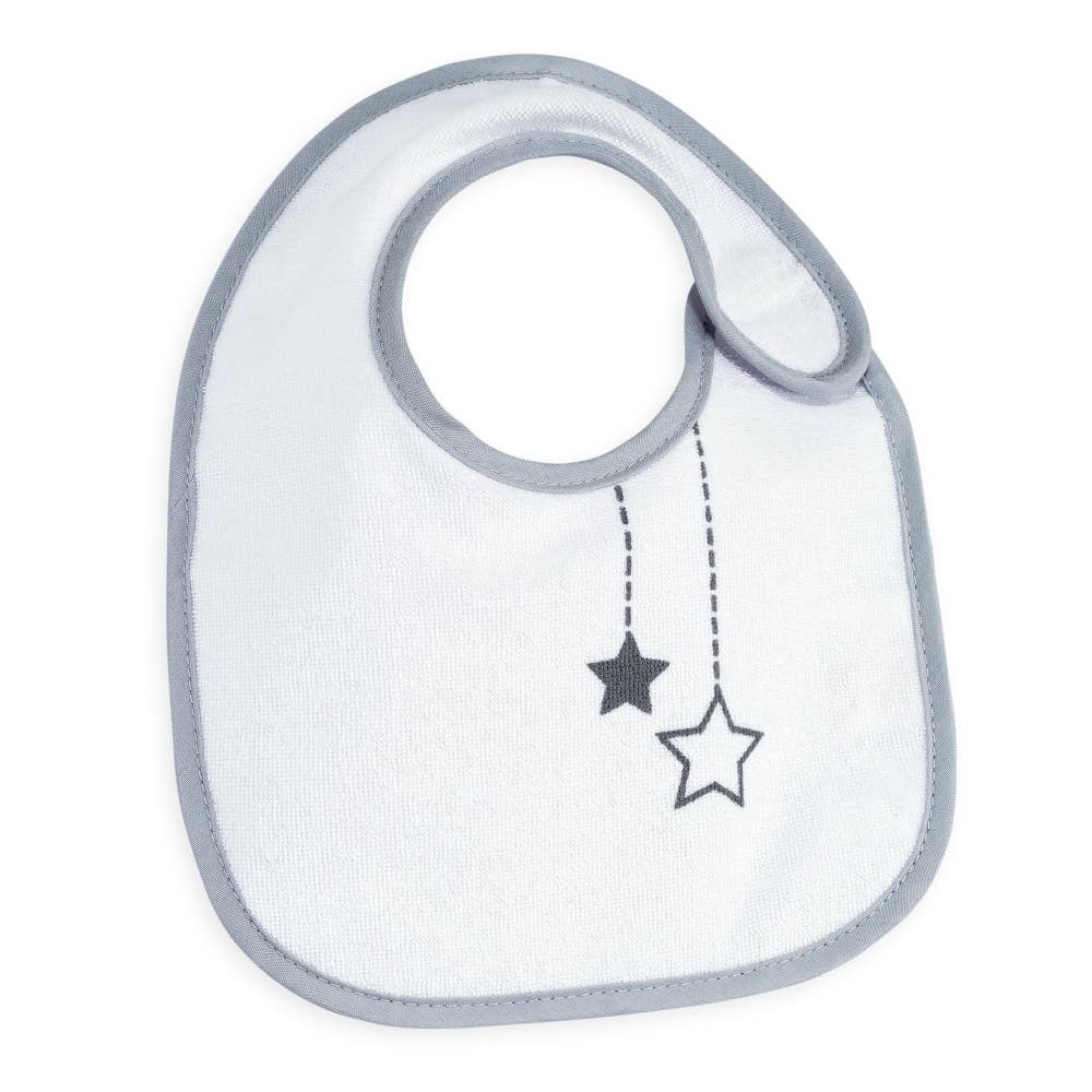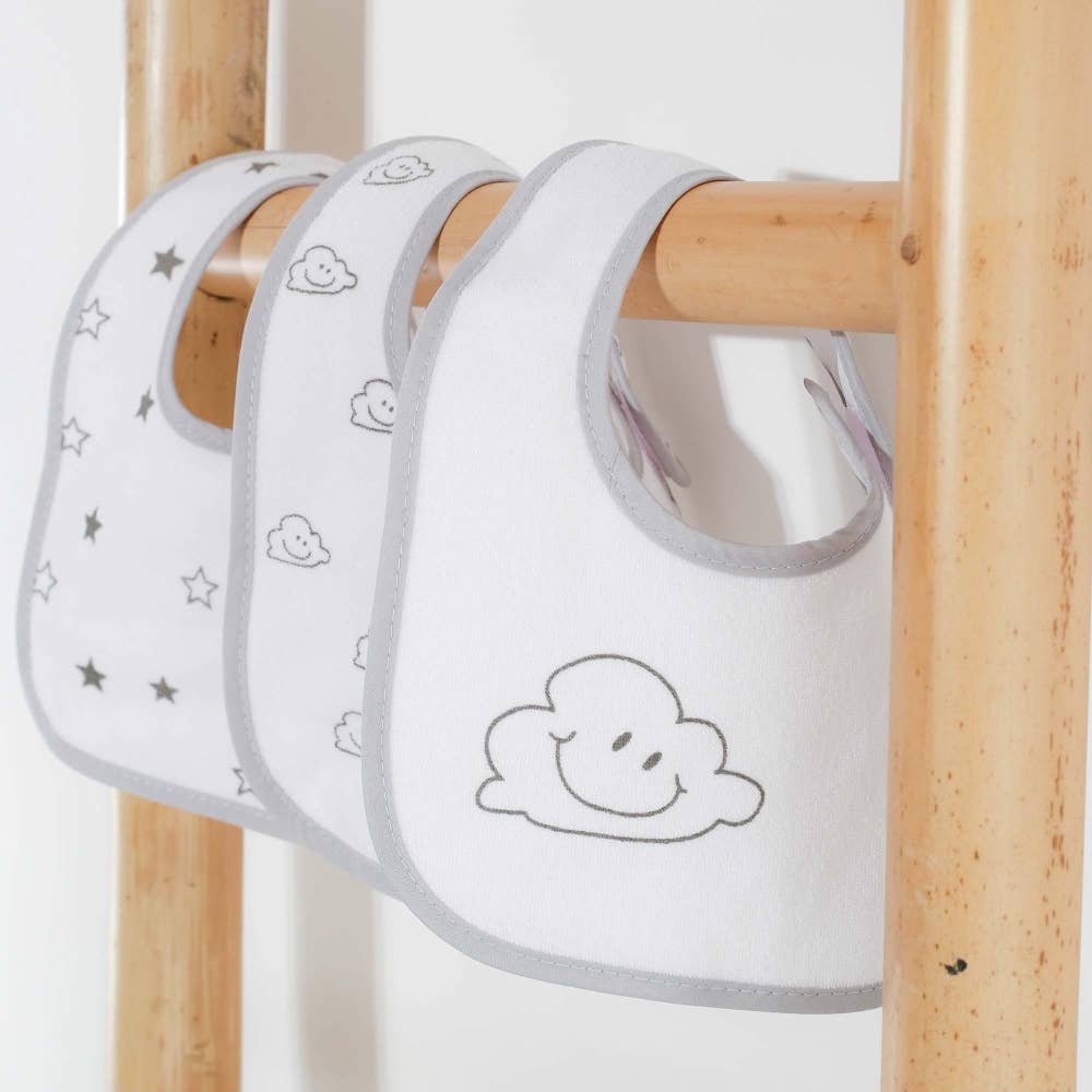 El babero es un elemento importante durante los primeros años del bebé, ya que mantiene seca la ropa del pequeño pero también evita el enrojecimiento del cuello debido a los líquidos. Nuestros baberos para bebés están hechos de esponja y están forrados para garantizar una absorción óptima. Compuesto por 7 baberos blancos lisos, cada uno de ellos está estampado con un patrón de nube o estrella sonriente. Los bordes de color gris claro traerán una armonía perfecta. Mezclados, serán fáciles de usar. Dedicados a los recién nacidos, se sujetan con un rasguño en el costado para limitar las manipulaciones.